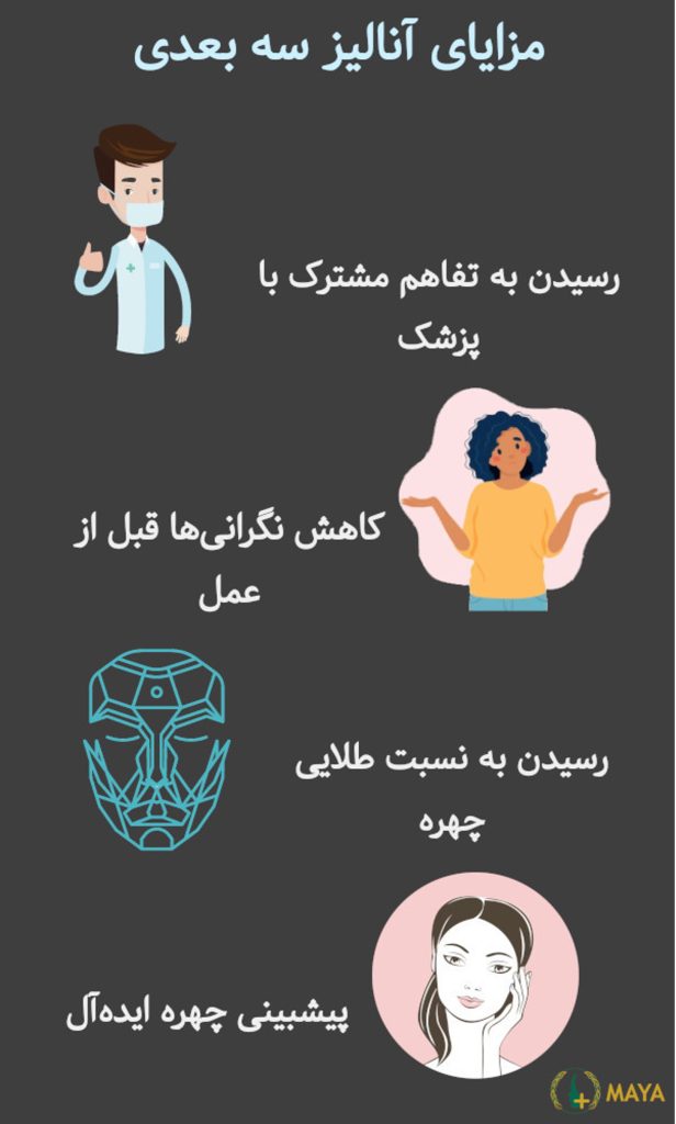 آنالیز سه بعدی کمک زیادی به جراح شما میکند، به وسیله آنالیز، پزشک شما میتواند ساختار صورت شما را بررسی کند و مشکلات و نواقص احتمالی را با دقت بالا تشخیص دهد که این نواقص میتوانند در معاینه اولیه قابل تشخیص نباشند. پزشک با این دادهها میتواند روش مناسبتری را برای جراحی انتخاب کند که باعث کم شدن ریسک جراحی میشود.